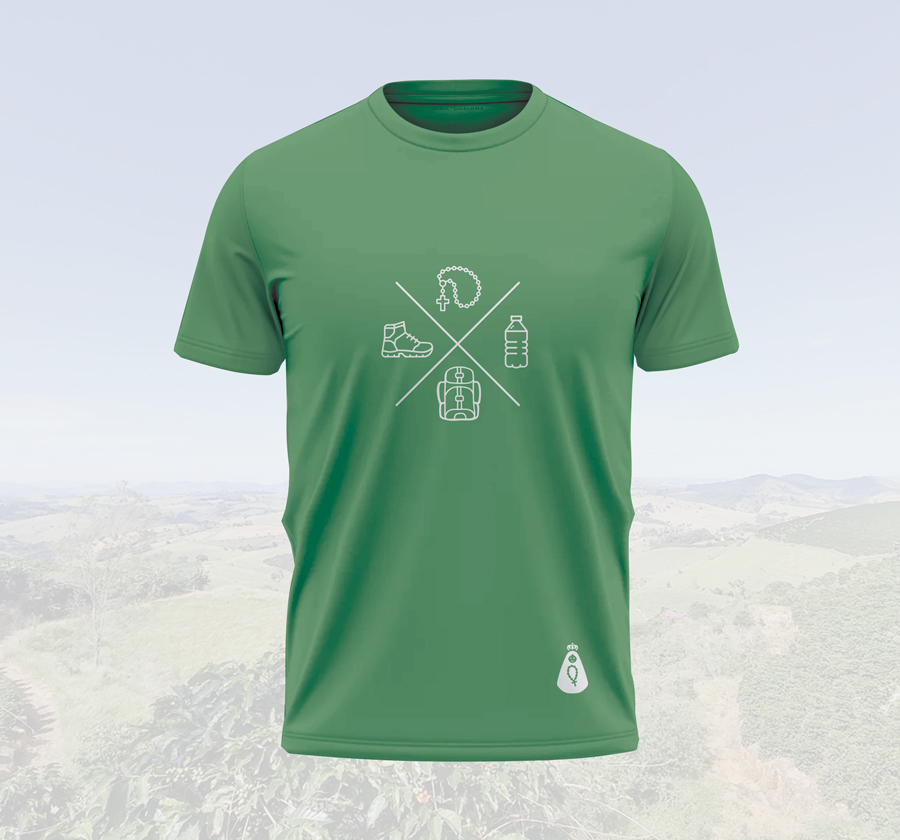 Uma arte pensada para quem carrega o espírito da caminhada. A camiseta “Peregrino” traz um design criativo com um X, onde cada espaço é preenchido com elementos essenciais da jornada: uma garrafa de água, um tênis, um terço e uma mochila de trilha.